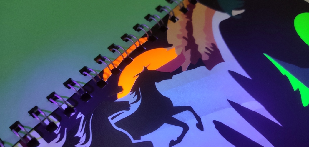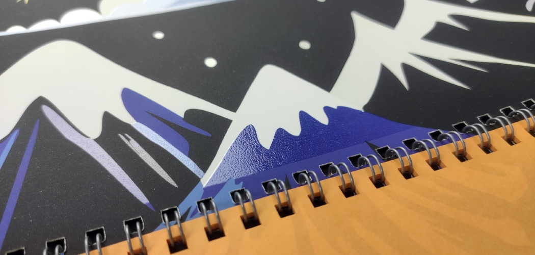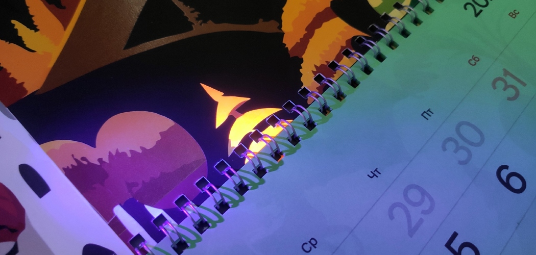 Максимально выделить контрастные элементы подложек позволило использование триадных офсетных УФ-красок RENK® UV LED SPIDER и флюоресцентных пантонов RENK® HU OFFSET UV LED FLUORESCENT. Глубину черного цвета фона подчеркнули не только светлые и темные плашки растительных узоров, но и сплошное ламинирование софт-тач пленкой BOPP SOFT TOUCH MATT THERMAL. Текст и числа на календарных блоках печатали базовыми УФ-пантонами UV PANTONE Warm Red и Black.