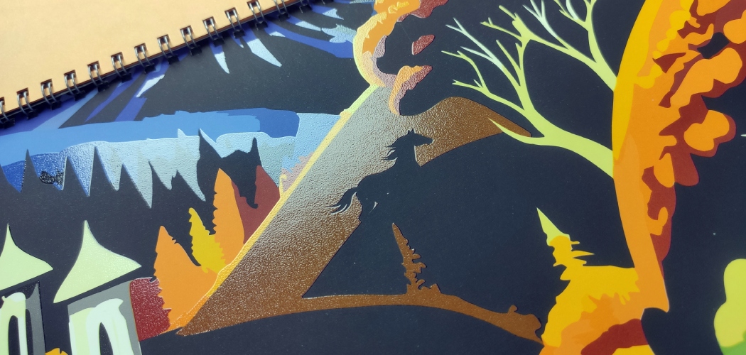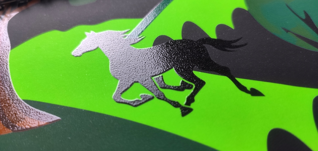 Декоративный эффект на подложках получили отделкой оттисков по ламинационной пленке тактильным трафаретным УФ-лаком, изготовленным на базе высоковязкого глянцевого VERN® UV silkscreen 21100 V300 с использованием специальных добавок. Лак наносился через 77 трафаретную сетку.